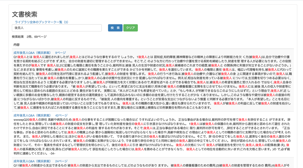 検索結果のうち、検索ワードにヒットした箇所は、赤くハイライト表示されます。
