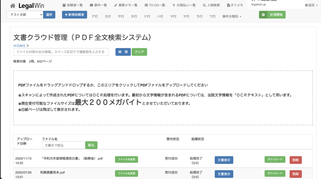 アップロードしたPDFについては、高精度のOCR処理が施され(もともとテキスト情報が含まれている文書については、そのテキスト情報を用います。)、アップロード済みのすべての文書を対象とした検索を行うことができるようになります。