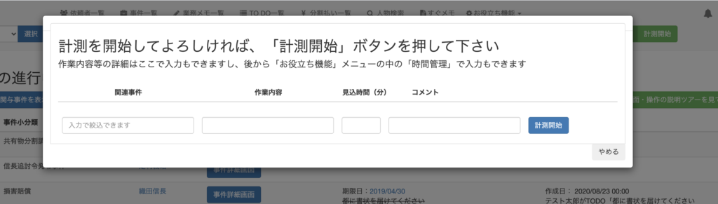 計測を行う事件や、作業内容をここで入力することもできますが、細かな情報は後で入力することもできますので、とにかく計測を開始したいという場合は、すぐ「計測開始」を押せばモーダル画面が閉じて計測が開始されます。