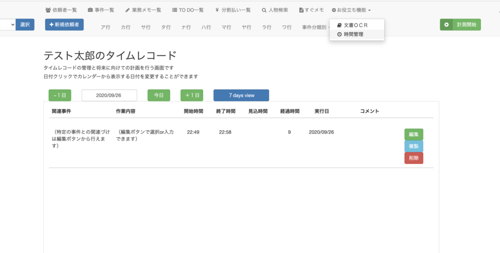 計測した作業記録(タイムレコード)は、上部メニュー「お役立ち機能」の中の「時間管理」で確認することができます。