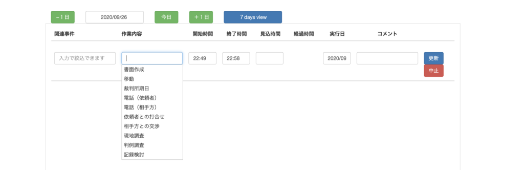 事件については、手持ち事件が一覧で表示されますので、その中から選択してください。文字を入力すると、絞り込みによって選択肢を減らすことができます。なお、ここで新たな事件を入力しても正しく反映されませんのでご注意ください。