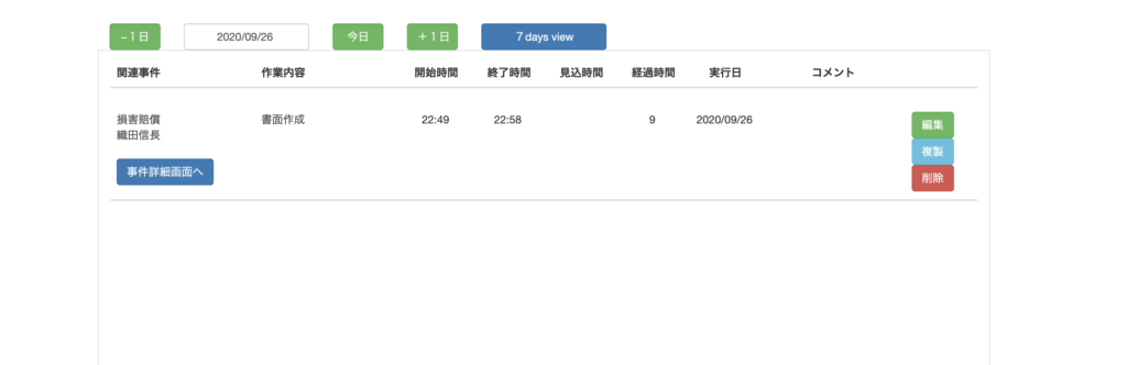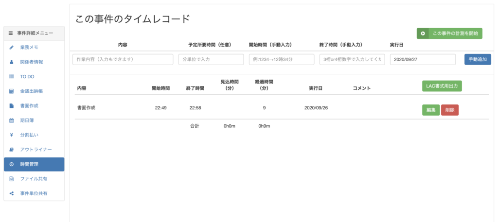 この画面では、当該事件に紐付けされたタイムレコードが日にち、開始時間順に並んで表示されます。合計時間も表示されますので、その事件にどのくらいの時間をかけているのかも把握することができます。