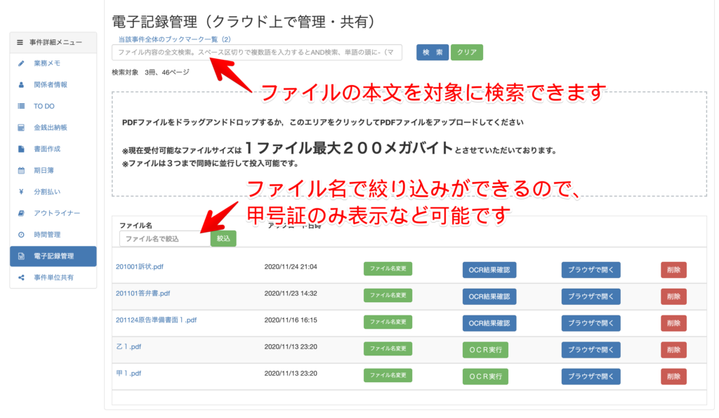 中でも電子記録管理機能は、ファイルを保存(1ファイル毎の容量制限はありますが、全体の保存容量制限はありません)するだけでなく、PDFにOCR処理をすることで全文検索を可能します。