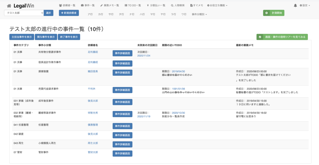 この事件一覧画面では、個別の事件の詳細画面へのリンクなどの表示のほか、その事件の次回期日(まだ到来していないもののみ)や期限の近いTODO、一番直近で入力された業務メモなどが表示されます。
