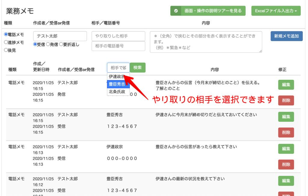 業務メモ一覧での対象となるのは、そのような関係者として登録するまででもない人との間のやり取りを探したい場合ということになります。