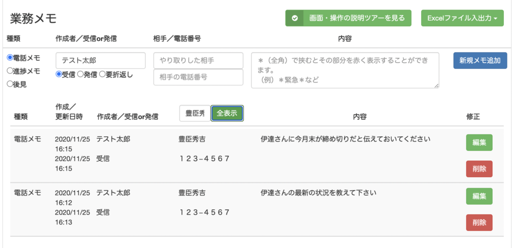業務メモの電話番号検索は、業務メモ一覧画面でできます