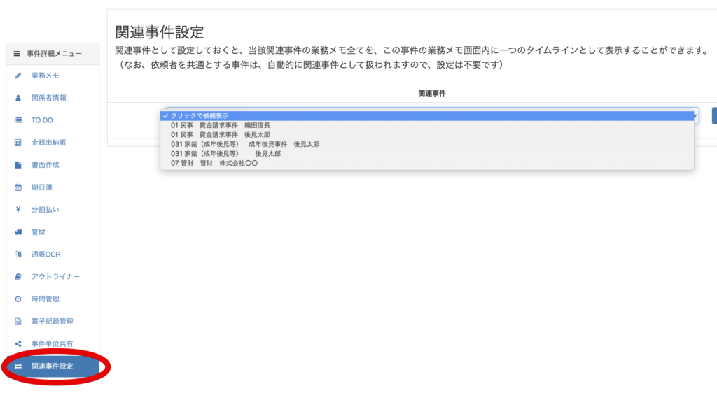 依頼者が共通の場合は、自動的に関連した事件と認識されますが、依頼者を異にする事件の場合は、「関連事件の設定」を行います。
