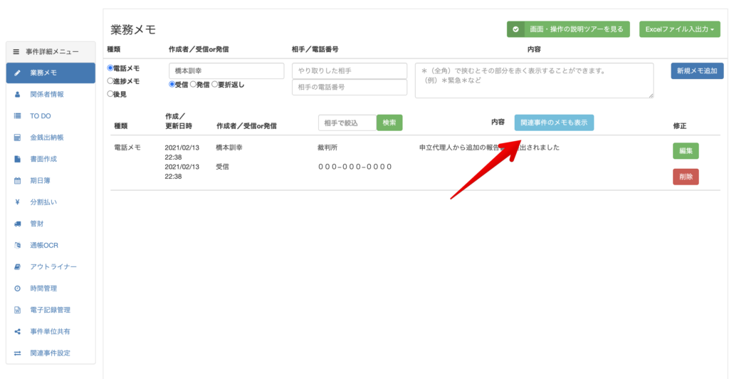 関連事件の設定がされている事件では、業務メモの画面に、「関連事件のメモも表示」というボタンが表示されます。