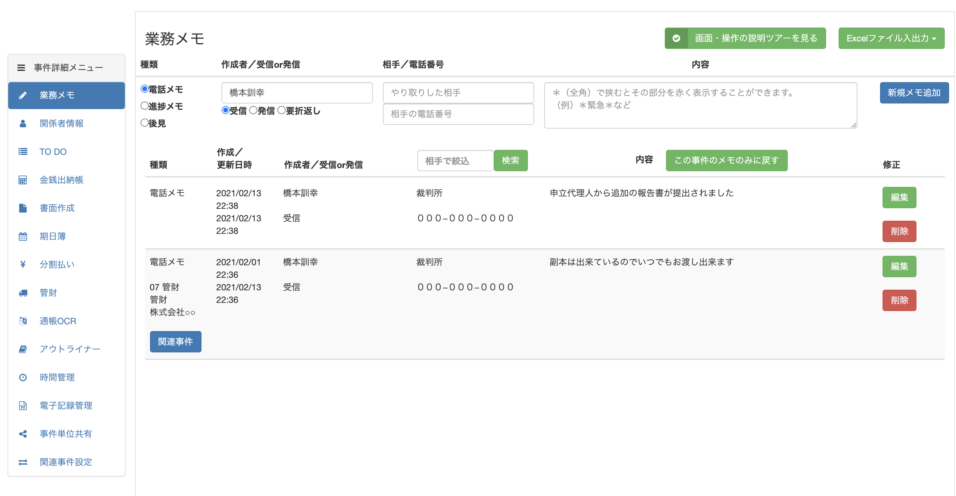 業務メモは事件の進捗を一つのタイムラインで一覧できるものです。