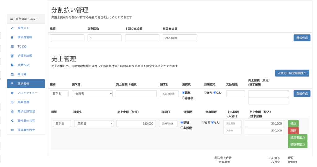 さらに、別途「時間管理機能」で、作業時間の記録をつけていると、この画面で事件ごとの時間単価が算出されて表示されます。