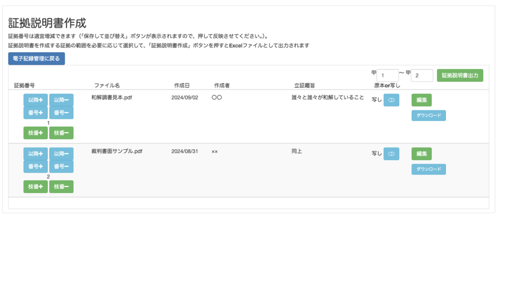 証拠説明書作成画面では、証拠番号の入れ替え(枝番の増減もできます)や、どの証拠からどの証拠までを証拠説明書に含めるかの選択が可能です。