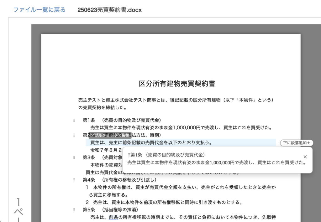 1 「契約書モード」では、第○条という部分が認識され、条項をドラッグ&ドロップで入れ替えることができるようになります。