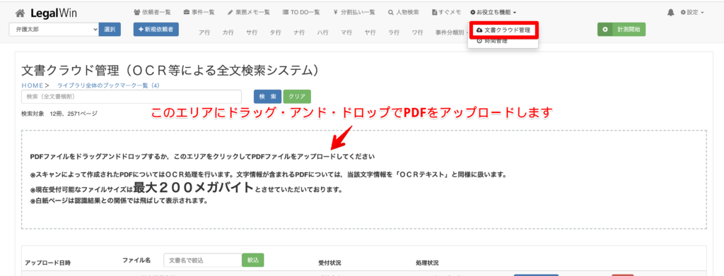 PDFのアップロードは、画面上部の「お役立ち機能」の中の「文書クラウド管理」メニューをクリックした先の画面で行います。