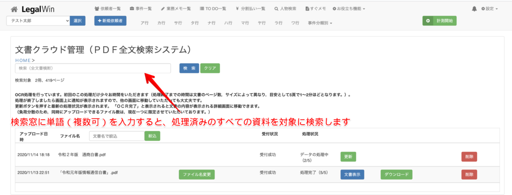 「文書クラウド管理(PDF全文検索システム)」という記載の下に検索窓があります。