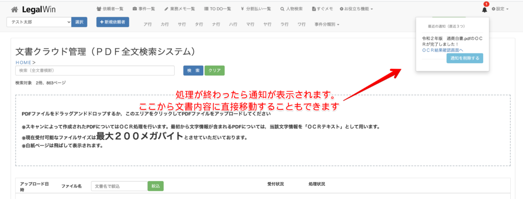 PDFのページ数に応じてOCR処理には、一定の時間がかかりますが、OCR処理が終わったら、画面上部に通知が表示されますので、その通知により知ることができます。