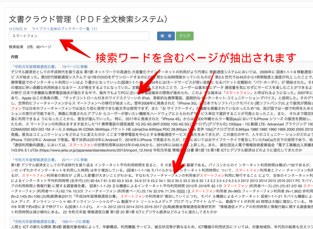 処理が終わった資料については、キーワードを入力することで、そのキーワードを本文に含む資料を検索することができるようになります。