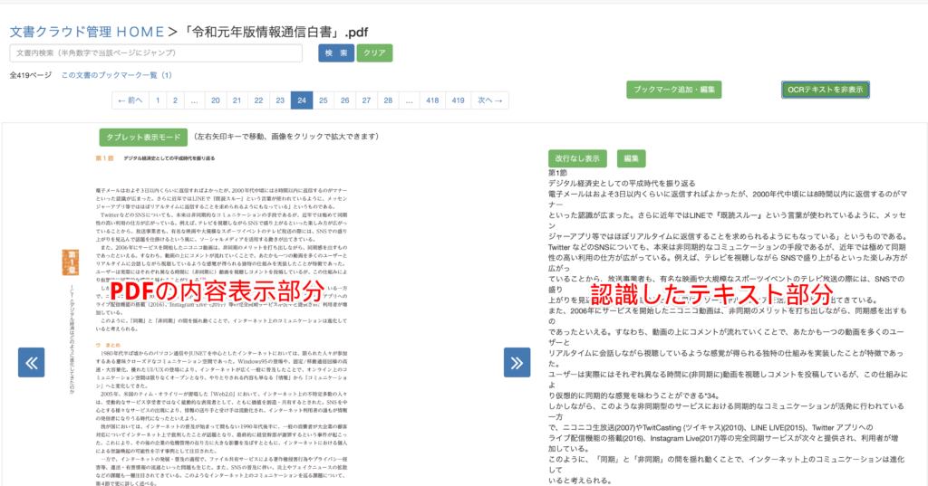 OCR認識結果を画像と隣り合わせで表示することもできます(最初からテキストを含んでいるPDFについては、当該テキストを認識結果として用います)。