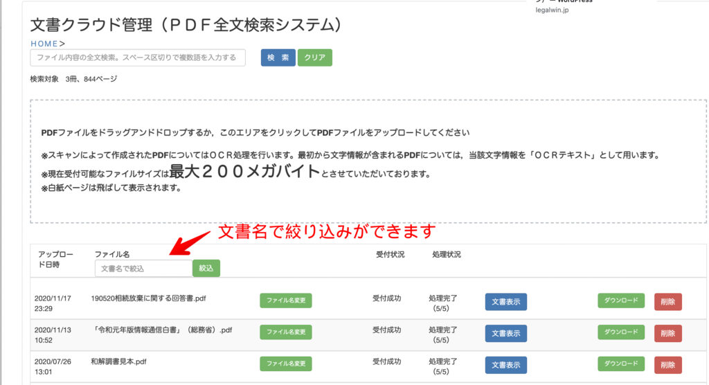 下記画像のように、アップロードされた文書一覧の上の部分に、文書名で絞り込みをするための入力欄がありますので、「絞込」ボタンで絞り込みを行うことができます。