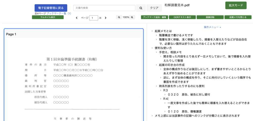 LegalWinドキュメント機能でOCR処理を行った記録について、記録の内容を見ながら手控えなどの